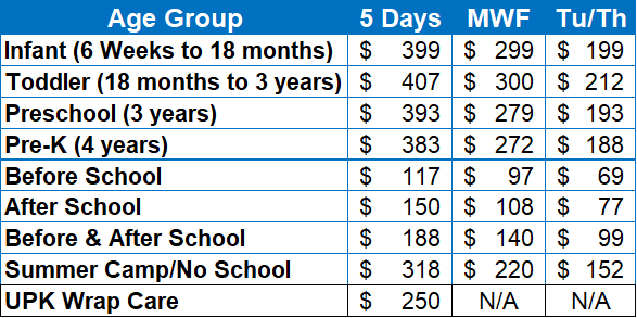 • refundable security deposit equal to one week’s tuition is also due. This deposit will be applied toward your last week’s tuition when your child withdraws with proper notice.